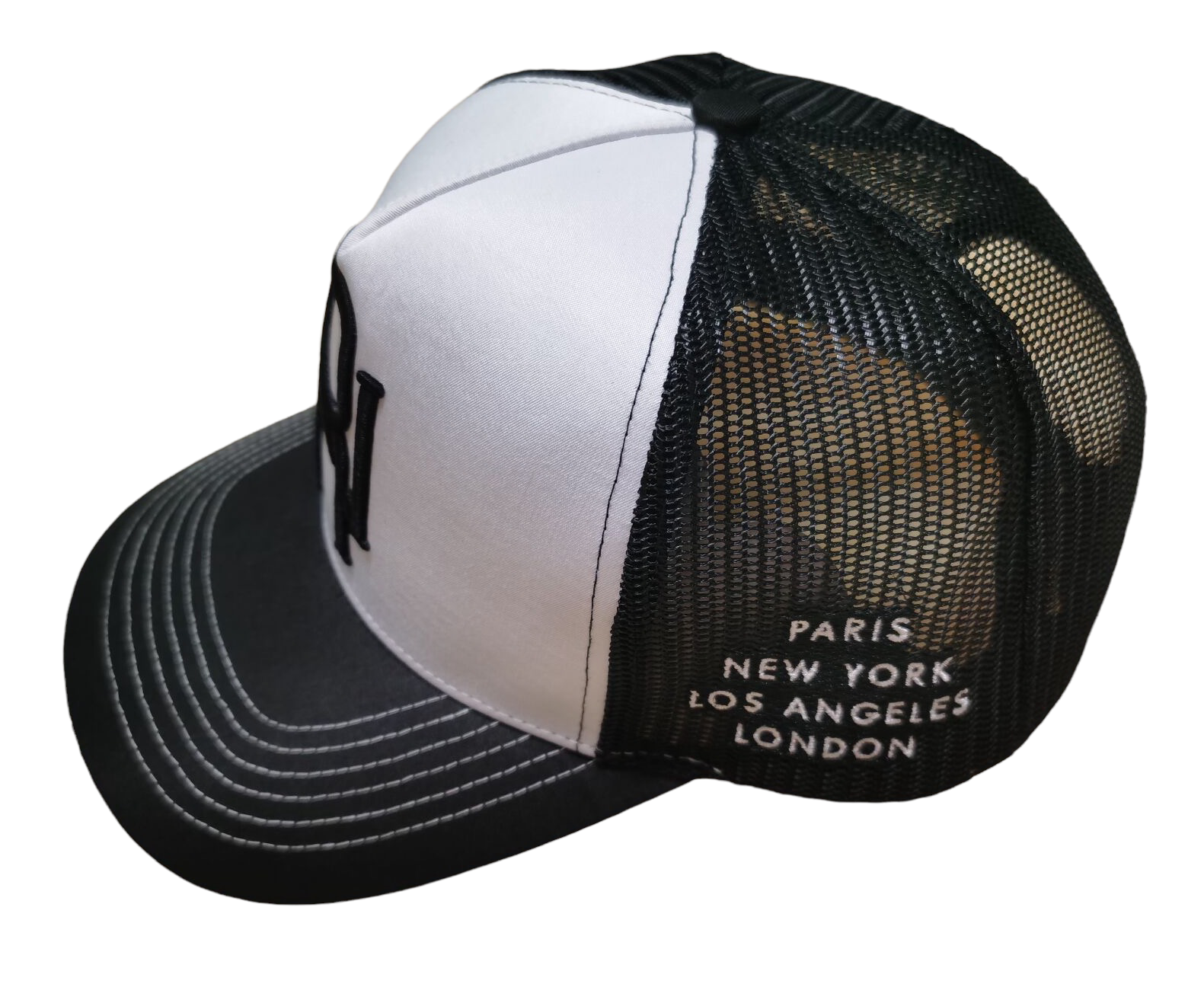 - Black white stitching + Curved bill