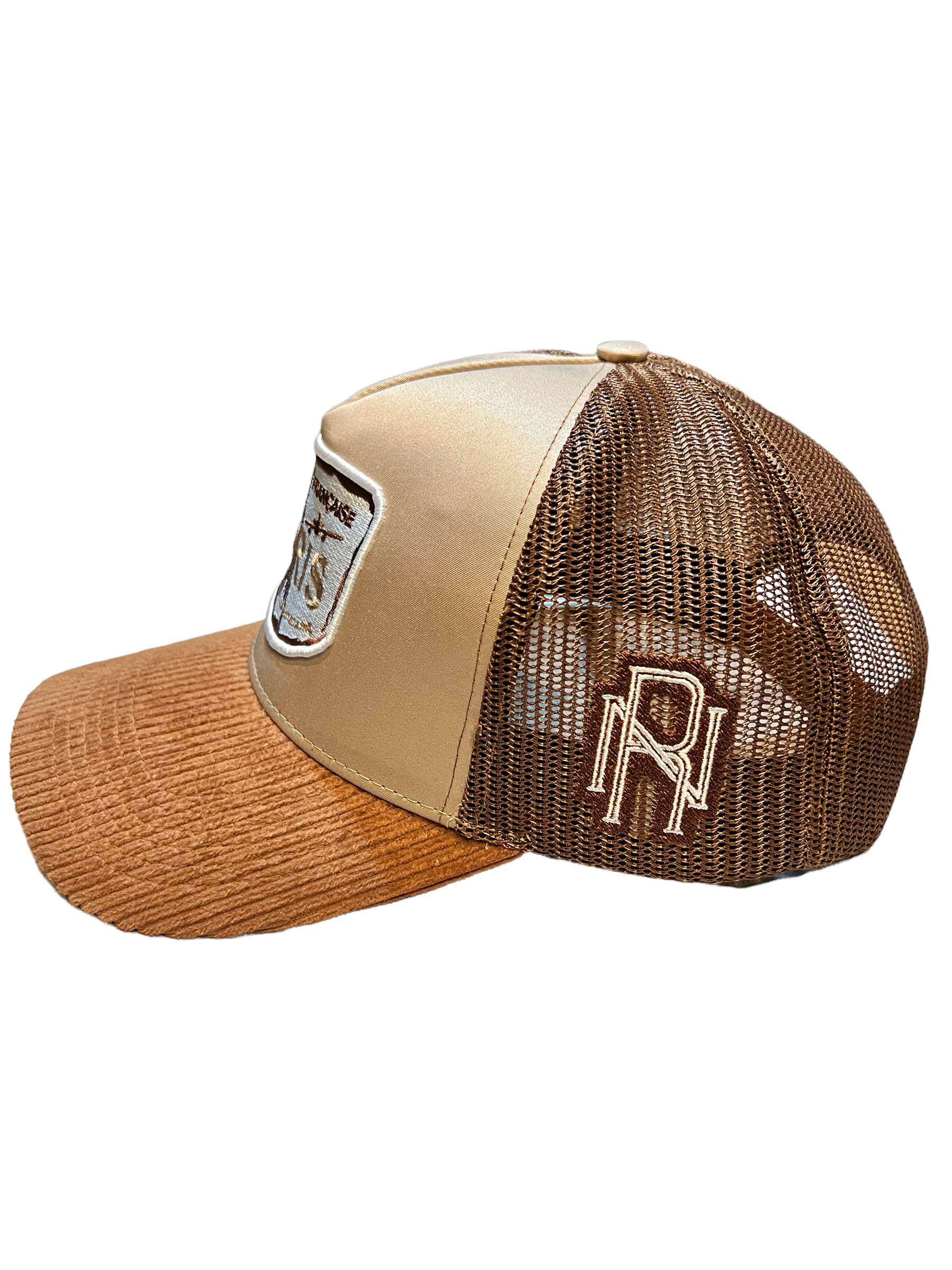 The Classic Corduroy Snapback Trucker Hat by Nouveau Riche features an iconic style with paris logo patch on the front, brown breathable mesh rear, and an adjustable snapback panel.